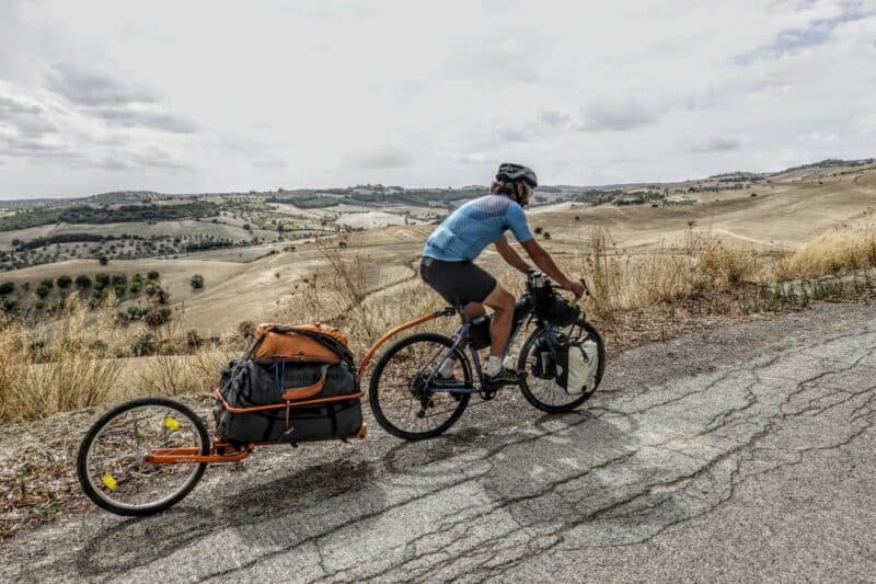 Cosi, la moglie Erika, appassionata cicloviaggiatrice, ha convinto Cala ad abbandonare le bici leggere usate per correre in gioventù in favore di una bici ben carica di tutta l’attrezzatura necessaria per esplorare l’Italia dai pedali e fermarsi in ogni regione per almeno un’attività alpinistica e una sessione di volo in parapendio.