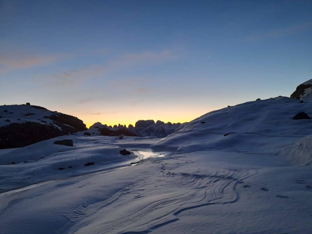 Cominciamo dalle cose più semplici. La prima cosa da tenere in considerazione è il tempo che abbiamo a disposizione per un’escursione in inverno. Se in piena estate ci sono mediamente 14-15 ore di luce in una giornata, in inverno queste sono ridotte drasticamente a 9-10. Quindi: partire presto, portarsi dietro la frontale (con batterie di scorta) e soprattutto scegliere un’escursione adatta alle proprie capacità, considerando anche le giornate più corte. Qui bisogna essere sinceri con se stessi e consapevoli delle proprie limitazioni. La neve rallenta di molto i movimenti: se in condizioni estive so di poter fare 15km e 800m di dislivello in una giornata, ovviamente dovrò ridurre il percorso per poter farcelo stare all’interno di una giornata più corta. Niente di male se si deve finire l’escursione al buio, anzi potrebbe rendere la giornata ancora più interessante. Allora però bisogna essere consapevoli del fatto che la visibilità sarà ridotta, non si riuscirà a valutare i rischi allo stesso modo che con la luce e quindi una conoscenza del territorio in cui ci si trova è fondamentale.