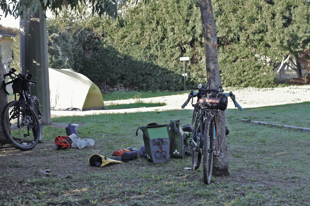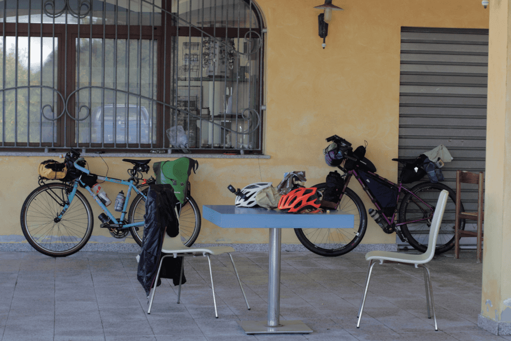 Le nostre bici sono cariche dell’essenziale (e – come spesso succede – anche qualcosa in più). Io viaggio in assetto da cicloturismo con le borse laterali Vaude da 15 litri l’una, invece Francesco sceglie la modalità bikepacking.