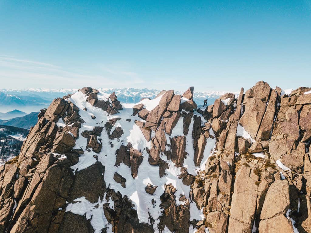 “In questa esperienza mi sono scrollato di dosso per l’ennesima volta ogni regola e ogni schema mentale, sono tornato nel mio habitat con la scusa di rimanerci il più possibile da solo. Mi ha accompagnato unicamente la neve sotto i piedi, il vento tra i capelli, lo sguardo rivolto all’orizzonte e nelle orecchie solo il rumore del mio respiro. Ho scelto di affrontare questo percorso mettendo tutto quello che fa parte del mio alpinismo o semplicemente di me stesso: leggero, veloce e da solo, scegliendo i versanti tecnicamente più belli ed impegnativi. Avevo programmato la partenza in primavera o comunque in coda all’inverno, ma quest’anno la neve a febbraio si è presentata molto assestata e dura, conseguenza delle nevicate seguite da pioggia anche in quota, e ho dovuto anticipare. Queste condizioni, seppur insidiose, mi hanno permesso di essere molto veloce, soprattutto sulle creste con i ramponi ai piedi. Non ho pianificato troppo, semplicemente ho voluto affrontare giorno dopo giorno le innumerevoli cime, sceglievo solo un punto di partenza senza sapere quale sarebbe stato il punto di arrivo alla sera. Per muovermi mi son affidato solo al mio istinto, nessuna carta, nessun mezzo tecnologico ad aiutarmi, tantomeno le innumerevoli guide relative al territorio. Semplicemente il mio sguardo e i miei occhi a guidarmi verso una cima dopo l’altra che vedevo davanti a me. Gran parte del percorso si è svolto su creste anche fortemente esposte e impegnative che andavano ben oltre i classici itinerari di alpinismo e scialpinismo e spesso con l’incognita di non riuscire a passare. Non è stata un’impresa ma una grandiosa avventura: camminando, scalando, sciando ho visto cervi, camosci, aquile, cedroni e lupi, mi son sentito ancor una volta far parte di questo ambiente e ne ho gioito. E tutto questo va ben oltre la pura performance sportiva.