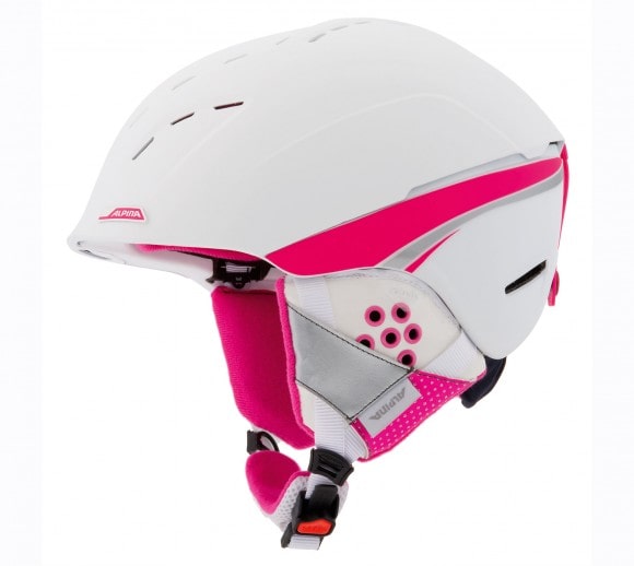 Il casco Alpina Spice, si presenta con un tocco di classe in più che attira sin da subito l’attenzione. A prima vista vediamo un casco dal design semplice ed elegante, con una forma tondeggiante. Il principale colore è il bianco, con inserti rosa/fuxia che rendono un effetto ottico molto dinamico. Al suo interno vi sono imbottiture anch’esse rosa e bianche. Il lacciolo è semplice e pratico, con un imbottitura che copre la striscia di cordura così da non provocar fastidio o irritazioni al mento. Notiamo anche la possibilità con un semplice gesto, aiutato anche dalla presenza di un a scritta push, di estrarre la protezione per le orecchie. Protezione che ha sul lato esterno dei buchi per favorire l’udito dello sciatore. La sensazione che ti da quando lo indossi per la prima volta è di ottimo comfort, ti trasmette subito l’impressione di un casco che ti permette di stare al caldo, ma dal peso ridotto, non gravando quindi sulla testa. Notiamo subito la presenza di una rotella sul retro che ci permette di sistemare la misura del casco a nostro piacimento, per star più comodi e in sicurezza. Esteticamente apprezziamo la semplicità di un casco pratico, bello e sicuro. (Olympia Cronin)