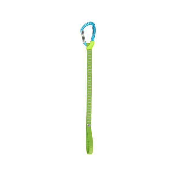 Il corpo del moschettone, è dotato di un sistema integrato, che consente di mantenere aperta la leva, permettendo così di moschettonare agilmente un ancoraggio lontano e rilasciando la stessa leva una volta che il sistema viene caricato verso il basso. La fettuccia semirigida è in poliammide e lunga 35cm, e l'asola presente nella parte inferiore della fettuccia consente di impugnare il sistema per azzerare agevolmente.