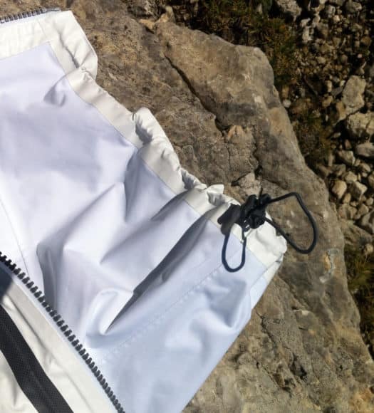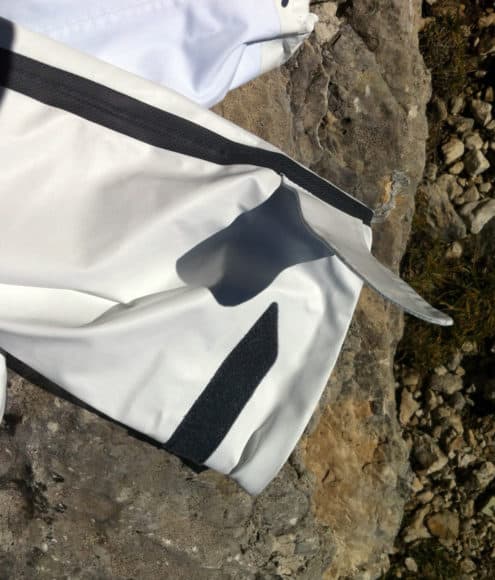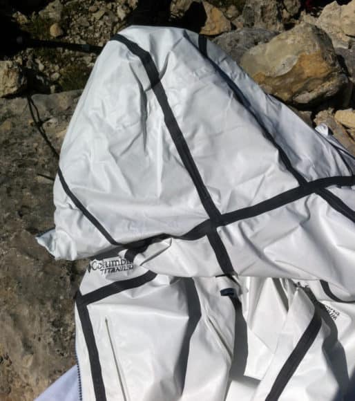 La giacca Outdry® EX Platinum Tech di Columbia si presenta decisamente come qualcosa di nuovo, di mai visto. In effetti, la sua superficie traslucida, le cuciture esterne a vista, la consistenza al tatto sono tutti elementi distintivi del prodotto, che però non sono frutto di mere scelte estetiche. La particolarità del prodotto sta nel fatto che la membrana idrorepellente e traspirante OutDry™ Extreme è applicata all'esterno, come primo strato, e non internamente come solitamente avviene. Il concetto alla base è semplice e geniale: fermare l'acqua prima che entri, per evitare appesantimenti del tessuto e, alla lunga, cedimenti. L'indossaggio del capo è pratico e veloce. Colpisce il rumore del tessuto, quasi un crepitio, dovuto alla consistenza dello stesso. La prima sensazione è di protezione, di avere addosso davvero un guscio capace di riparare anche nelle condizioni più avverse. Eseguendo movimenti di busto e braccia, il capo segue agilmente e con precisione, non si avvertono sensazioni di interferenza con i gesti, fatta eccezione per il già citato rumore, che, in azione, persiste e si nota. La giacca è completata con solide cerniere YKK a maglia grossa (anteriore) e fine (2 tasche al petto, 2 tasche laterali, aperture di aerazione sotto ascella), tutto protette da acqua e vento. Cappuccio con visiera semi rigida, regolabile mediante 2 tiranti interni (laterali) con meccanismo di fissaggio e sblocco nascosto nel tessuto.