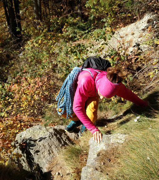 Siamo arrivati in valle dell'Orco verso le 10.00 di un bellissimo sabato mattina per testare le Kayland Gravity GTX, donna e uomo. Abbiamo voluto dedicare il giusto tempo per calzare le scarpe, ben sapendo che i modelli da avvicinamento, talvolta, possono presentare qualche difficoltà e necessitano di una fase di adattamento. L'accesso è risultato ampio al punto giusto per consentire una rapida entrata del piede. Il primo impatto, quando il piede incontra i volumi interni, è stato piacevole e senza alcuna sensazione di pressione o costrizione indesiderata. L'operazione di allacciatura, è molto pratica e veloce grazie ai lacci destrutturati e cavi all'interno che, in virtù dell'attrito con gli occhielli direttamente ricavati nella tomaia, riescono a mantenere memoria della trazione. Eseguiti i primi passi, prima di intraprendere la salita, abbiamo verificato un adattamento del piede molto veloce, quasi immediato, che ci ha consentito di iniziare la giornata nel migliore die modi. La temperatura era di circa 7°C e ci siamo incamminati lungo il sentiero che porta alla parete del Sergent. L'idea era quella di affrontare la via Locatelli con variante Grassi. L'avvicinamento prevede un tempo di circa mezz'ora e si sviluppa su un tracciato misto, ma prevalentemente roccioso con un grado di pendenza da medio a sostenuto. Procedendo lungo il percorso, la Kayland Gravity GTX ha offerto sostegno al piede permettendogli comunque di muoversi agilmente sia in piano, sia sul bel granito del percorso. Essendo il modello di taglio basso la caviglia rimane scoperta e la flessione su pendii risulta agevolata. Abbiamo provato dei tratti su roccia appoggiata sentendoci sicuri della tenuta della suola e questo è stato confermato quando abbiamo percorso una breve salita in fessura su un masso granitico sotto la parete senza indossare le scarpette d'arrampicata. In termini di sicurezza e solidità anche la discesa è stata ottima e la scarpa ha continuato ad ammortizzare il movimento del piede sia sul sentiero, sia sui tratti rocciosi piuttosto ripidi. Durante la giornata la temperatura è salita ma il piede non era eccesivamente caldo, anzi la calzata è sempre risultata confortevole. Le Kayland Gravity GTX sono state appese all'imbrago durante la via grazie alla presenza dell'anello posteriore, sufficientemente grande per l'utilizzo con moschettoni. Una comodità in più da non sottovalutare.