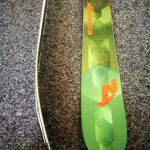 Lo sci Nordica Navigator 90 ha le dimensioni tipiche di un moderno sci polivalente per divertirsi nelle giornate di neve fresca senza la necessità di dover cambiare lo sci in pista. Vivace in varie tonalità di verde, mi ricordano i colori della giungla e della pelle squamata dei serpenti. Questo soprattutto per le parti esagonali a vista in Titanio "Hex Titanium Bridge" si davanti che dietro, applicate per conferire stabilità e rigidità con il vantaggio di pesare meno rispetto ad un foglio intero di titanio. Logo Nordica e dettagli dello sci sono in arancione acceso. Costruzione sandwich, anima in legno e fianchi dritti di colore bianco. Sia punta che coda si staccano gradualmente dalla linea di appoggio, il rocker è leggero sia in coda che in punta. La coda è tondeggiante e termina con la protezione in plastica con l'incasso per il bloccaggio delle pelli. La punta è circondata totalmente dalle lamine, è regolarmente tonda e sale dolcemente verso l'alto. La soletta è nera con il grande logo "N" sulle due punte. Alla prova manuale di flessione lo sci si inarca regolarmente da cima a fondo senza particolare rigidità sulla parte centrale, soprattutto per il fatto che il tipo di sci non richiede il montaggio della piastra sotto l'attacco.