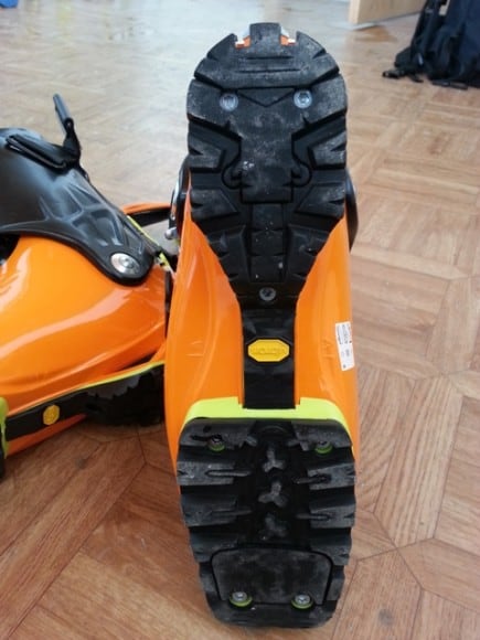 Lo scarpone da sci Scarpa Freedom RS ha una bella linea, arancione e nero con dettagli gialli e bianchi. 4 ganci con regolazione micrometrica, i 2 superiori sono regolabili in 3 posizioni per polpacci di diversa costituzione. Lo strap di 4,5 cm. è con chiusura a velcro con doppia asola metallica per favorire la tensione. Il gambaletto ha il fascione in plastica molto alto e avvolgente che termina superiormente con un bordo dentato per mantenere lo strap in posizione. La suola è in Vibram, integrata nel sottosuola (parte gialla) sostituibile con 7 viti a brugola. L'intersuola è in gomma morbida per ammortizzare il tallone. E' presente la regolazione canting. La leva posteriore Ski/Walk ha un sicuro bloccaggio ad uncino ed è regolabile in 3 posizioni per conferire una diversa inclinazione del gambaletto. Sulla posizione Walk l'escursione antero-posteriore sembra buona. E' presente uno spoiler posteriore a supporto del polpaccio, regolabile in due diverse posizioni. Tra le due alette in plastica sul dorso del piede è stata inserita una guarnizione morbida in gomma per evitare l'entrata della neve. E' integrato il sistema per l'utilizzo degli attacchini da sci alpinismo. La scarpetta è molto calda e ben imbottita, senza lacci o regolazioni. Il linguettone è irrigidito esternamente. Le due grandi asole facilitano la calzata e il giusto posizionamento della scarpetta ma quella sul linguettone è cucita leggermente in basso e quasi sparisce sotto lo scafo. La soletta è morbida e leggermente sagomata sul tallone. (Riccardo Stacchini)