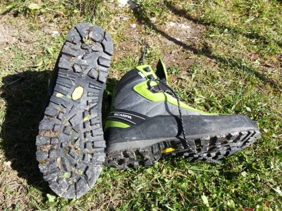 Lo scarponcino Marmolada Trek del marchio Scarpa è un prodotto tecnico da trekking (come dice il nome) di un bel colore verde acceso. La membrana utilizzata è la OutDry, novità per la Scarpa, da sempre legata commercialmente al marchio Gore-tex. La particolarietà di OutDry è che lo strato impermeabile e traspirante è posizionato subito al di sotto della tomaia e sopra all'imbottitura, al contrario degli altri marchi che assemblano la membrana come primo strato al contatto con il piede. Il risultato dovrebbe essere: calzatura non inzuppata in caso di forte e prolungata pioggia con il mantenimento della leggerezza originaria. Alla flessione manuale la suola sembra più rigida di ciò che è in realtà. Il perimetroè totalmente circondato da un bordo protettivo in gomma, la punta e il tallone sono più maggiormente rinforzati rispetto al resto. Ottima la struttura, sufficientemente rigida per quanto necessita durante un trekking, anche impegnativo. Le parti verdi sono in pelle scamosciata, mentre i fianchi sono in trama sintetica. Il collare è ben imbottito e contornato in pelle nera. La linguetta è elasticizzata, ma non sempre aderente presentando all'esterno qualche grinza (all'interno è perfetta). La parte superiore è ad ala e necessita di tanta attenzione e meticolosità per posizionarla correttamente durante il serraggio dei lacci. I laccetti sono ovalizzati e passano attraverso 2 occhielli, 6 fettucce cucite e 2 ganci finali non autobloccanti. L'allacciatura risulta quindi facile ed efficace, tranne sulla parte superiore. Suola in Vibram, intersuola in materiale ammotizzante non diversificato. Un'ampia e comoda asola posta sul collare aiuta la calzata che necessita di una leggera pressione per entrare. Internamente l'imbottitura è ben confezionata, senza grinze o sovrapposizioni. La soletta è semplice e sagomata sul tallone. (Riccardo Stacchini)