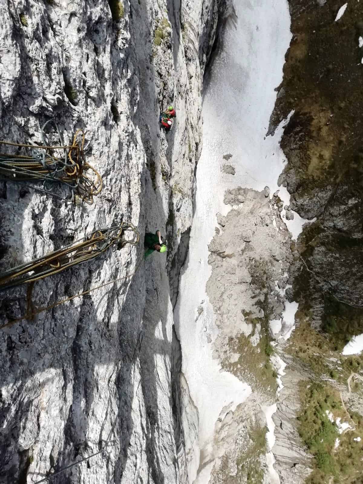Quando arrivò Tom ci congratulammo a vicenda per la nostra impresa al limite delle capacità umane oltre il VI grado superiore, imitando scherzosamente i vecchi racconti alpinistici del passato. Data la quantità abbondante di neve nel canale per la discesa preferimmo scendere lungo la via, aspettammo quindi che l’altra cordata arrivasse su per allestire le doppie. Da Est stavano arrivando delle nuvole molto minacciose, era meglio sbrigarsi perché l’idea di stare appesi sotto ad un temporale non ci entusiasmava.