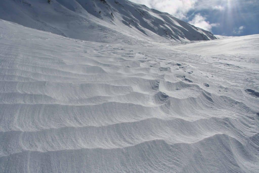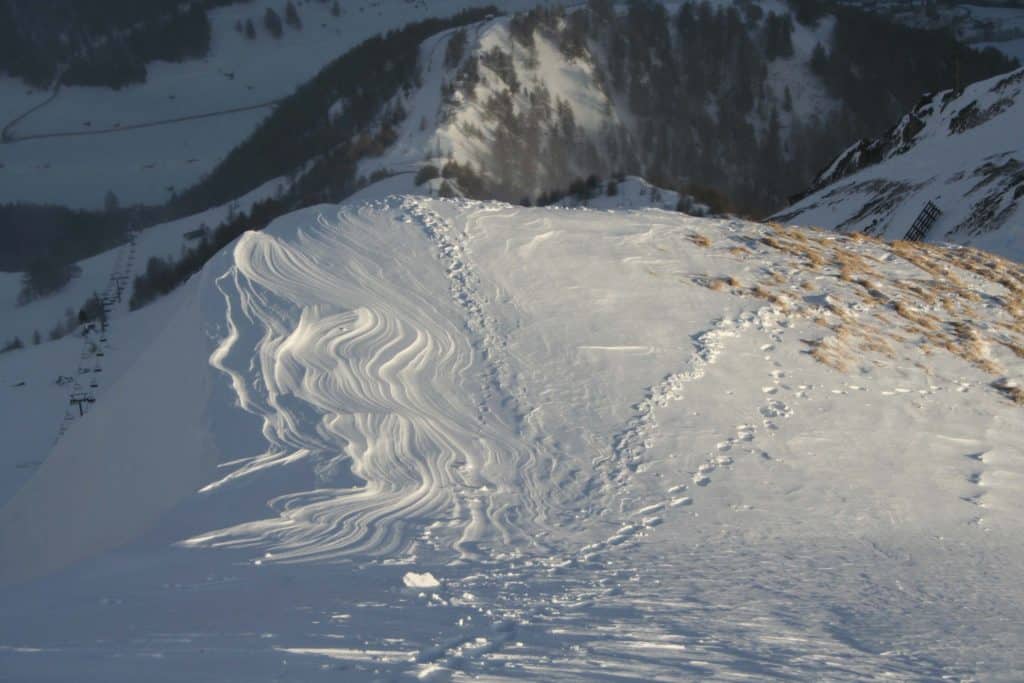 Scolpiture: velocità prossima ai 50 km/h, si formano delle corrugazioni dove il gradino questa volta guarda controvento. Quando il vento supera i 50 km/h l’erosione è irregolare e forma corrugazioni che ricordano il mare mosso, capirne la direzione è difficile quindi prestare attenzione alle zone in cui il vento può aver rallentato e quindi accumulato la neve (cambi di pendenza, ostacoli come gruppi di alberi, avvallamenti).